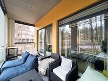 Olohuoneesta on kulku todella tilavalle lasitetulle terassille, jossa saa rauhaisasti nautiskella metsäisistä näkymistä. Terassilasituksen saa halutessaan kokonaan auki.