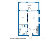 Asunnon pohjaratkaisu on tehokas pitäen sisällään avokeittiö-olohuone yhdistelmän sekä makuuhuoneen liukuovella. Makuuhuoneesta löytyy myös kaapistot säilytystilaa varten.