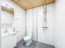 Tyylikäs kylpyhuone on tilava ja siellä on hyvä paikka pyykinpesukoneelle tai vaikkapa pesutornille. Tämän kodin vaaleat ja tyylikkäät pintamateriaalit antavat loistavan pohjan sisustukselle! Helppo kulkuinen kiitos pohjakerroksen sijainnin.