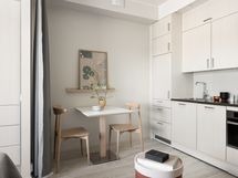 This stylish, fully furnished studio comes with a bed, table and chairs, storage space, lighting, basic appliances, textiles, and essential household items. The combined kitchen and bedroom area with a bathroom is a functional and cozy space where you can relax in peace. The studio is pet-friendly.