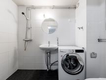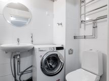 Kylpyhuone on juuri remontoitu ja sisältää pyykinpesukoneen.