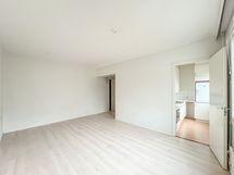 Asunnossa on valoisa huone joka yhdistyy eteiseen, jossa on runsaasti säilytystilaa vaatekaappien ansiosta.
