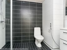Kylpyhuoneessa seinät ovat isoa, kiiltävän valkoista laattaa. Lattiat ja tehosteseinät ovat harmaata laattaa, jonka sävy vaihtelee portaittain. Valkoiset kylpyhuoneen kalusteet ovat kotimaista Kide-mallistoa. Pesukoneelle ja kuivausrummulle on varaus.