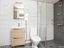 Kylpyhuoneessa seinät ovat pääosin valkoista laattaa. Tehosteseinän ja lattian sävy on harmaa. Laattojen alla jalkoja hellii lattialämmitys. Pesukoneelle ja kuivausrummulle on varaus.