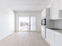 Vuonna 2018 valmistuneessa kerrostalokodissa on ihanat suuret ikkunat, miellyttävät tammilautaparketti ja valkoisiksi maalatut seinät.