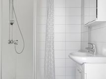 Iso kylpyhuone, joka uusittu v 2015. Suihkuseinä, peilikaappi, pesukoneliitäntä pyykinpesukoneelle ja kaikkialla laattapinta. Pesukoneelle on hyvin tilaa.