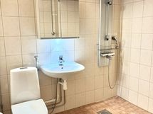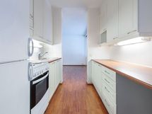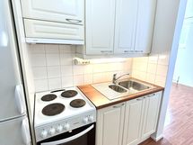 Paljon kaappitilaa, Suuri tiskipöytä, Laminaattitasot, Sähköliesi, Jääkaappi, Pakastin