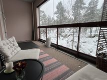 Tämän pohjaltaan erinomaisesti suunnitellun 36 neliön kaksion ehdoton katseenvangitsija ovat sen suuret seinänlevyiset ja lattiasta kattoon ylettyvät ikkunat, jotka jatkuvat sekä makuuhuoneen että olohuoneen puolella. Varsinaisen asuinpinta-alan lisäksi tila jatkuu hulppean suurelle ja kokonaan lasitetulle 11,5 neliön parvekkeelle, joka toimii kevät-, kesä- ja syyskausina kuin ylimääräisenä lisähuoneena.
