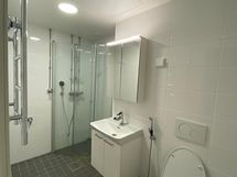 - Suihku, Suihkuseinä, Laattalattia, Laattaseinä, Pesukonevalmius, Lattialämmitys, Allaskaappi, Peilikaappi