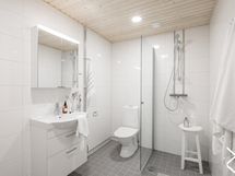 - Pesutilojen kuvaus: VARUSTUS: Suihku, suihkuseinä, wc-istuin, käsisuihku, peilikaappi, lavuaari, allaskaappi, pesukoneliitäntä, lattialämmitys.