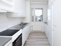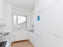 Keittiössä on jää-pakastinkaappi ja nelilevyinen sähköliesi.