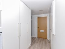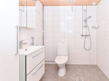 Arjen varma piristys on uutuuttaan hohtava kotikylpylä, jonka seinät ovat valkoista ja lattia harmaata laattaa. Tehopohjaisessa kylpyhuoneessa on tilaa myös pyykkikoneellesi. Pyykkien lajittelu ja säilytys hoituu sujuvasti pyykkikaapin ansiosta.