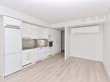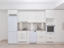 Kodin vaaleat pintamateriaalit luovat neutraalin pohjan omalle tyylillesi. Lattiat ovat vaalean tammensävyistä laminaattia ja seinät on maalattu vaaleiksi. Ikkunoissa on valkoiset sälekaihtimet. Tasokkaassa keittiössä on valkoiset kaapistot ja metallinväriset vetimet. Ylä- ja alakaappien välinen tila on vaaleaa laminaattia tai rosteria, tasot harmaata laminaattia tai rosteria. Täysvarustellussa keittiössä on induktiotaso, kalusteuuni, liesikupu, astianpesukone ja jääkaappipakastin. Mikroaaltouunille on tilavaraus. Tässä keittiössä on ilo kokkailla!