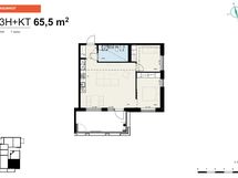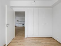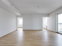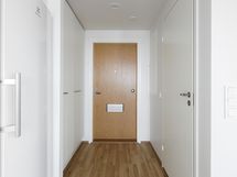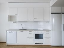 The floors in the living areas are covered with light oak laminate and the bathrooms are tiled with comfort floor heating powered by the apartment’s electricity. The bathrooms also have space for a washer-dryer tower. The kitchen cabinets are white and the countertops have a gray-toned finish. The kitchen is equipped with a ceramic cooktop, built-in oven, fridge-freezer, dishwasher, and a reserved space for a microwave. The windows of the apartments are fitted with Venetian blinds. The apartments have a centralized mechanical supply and exhaust ventilation system.