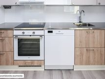 Kodin vaaleat pintamateriaalit antavat neutraalin pohjan omalle, persoonalliselle tyylillesi. Lattiat ovat vaaleaa tammensävyistä laminaattia ja seinät maalattu vaaleiksi. Ikkunoissa on valkoiset sälekaihtimet. Keittiöissä on beigen ja tammen väriset kaapistot, ylä- ja alakaappien välinen tila on vaaleaa kalustelevyä ja tasot ovat harmaakuvioitua laminaattia tai rosteria. Täysvarustellussa keittiössä on keraaminen liesitaso uunilla, valaistu liesikupu, astianpesukone ja jääkaappipakastin. Mikroaaltouunillekin on tilavaraus. Tässä keittiössä on ilo kokkailla perheelle ja ystäville!