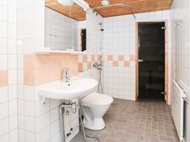 Asuinhuoneiden lattiamateriaalina on muovimatto, kylpyhuoneessa on muovimatto ja laatoitetut seinät.