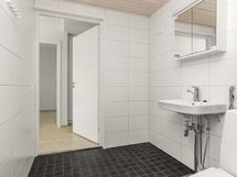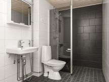 Kylpyhuoneen sisustus jatkaa kodin raikasta linjaa valkoisine seinälaattoineen ja tummine tehoseinineen. Lattiassa on mukavuuslämmitys. Pyykinpesukoneelle löytyy oma paikka ja pesukoneliitäntä. Taloyhtiön sauna ja pesutupa ovat asukkaiden käytössä ilman lisämaksua. Huom! Kuvat malliasunnosta peilikuvana.