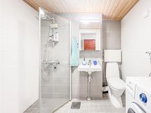 Tyylikkäästi laatoitetussa kylpyhuoneessa on pyykinpesukone valmiina asukkaan käytössä. Vuokralaisen on itse mahdollista hankkia asuntoon astianpesukone, jonka vuokranantaja kustantaa.
