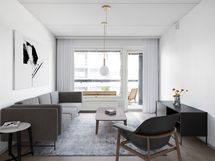 Huom! Asunnon kuvat ovat kiinteistön toisesta kaksiosta. Pintojen materiaalit asunnoissa ovat samoja. Kuvien sisustus on toteutettu virtuaalisesti.