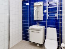 Kylpyhuone on laatoitettu kauttaaltaan.  Kiiltävä koboltinsininen seinälaatta piristää muutoin kylpyhuoneen rauhallisen valkoista ilmettä. Beigen sävyisessä lattiassa on mukavuuslämmitys ja suihkunurkassa on kätevä kääntyvä lasiseinäke, jota kääntämällä saa mukavasti lisätilaa tarvittaessa. Kylpyhuoneeseen on varattu tila pyykinpesukonetta ja kuivausrumpua varten.