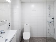 Modernissa ja harmonisessa kylpyhuoneessa on vaaleanharmaa laattalattia ja valkoinen seinälaatoitus. Säilytystilaa löytyy myös kylpyhuoneesta allaslaatikoston ja peilikaapin ansiosta. Yhdessä kirkkaan suihkuseinän ja valkoisten kalusteiden kanssa kylpyhuone muodostaa viehättävän kokonaisuuden, jossa tilaa on myös pyykinpesukoneelle.