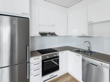 Kodin modernissa keittiössä on kauniit korkeakiiltoiset kaapit tyylikkäillä vetimillä ja kestävä vaaleanruskea kivitaso. Valitut Electroluxin kodinkoneet ovat tyylikkäitä, ja kodinkonevarusteluun kuuluu täyskorkea jääkaappipakastin, integroitu laadukas uuni ja keraaminen keittotaso. Lisäksi arkea helpottaa keittiöstä löytyvä astianpesukone.