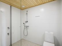 Modernissa ja harmonisessa kylpyhuoneessa on vaaleanharmaa laattalattia ja valkoinen seinälaatoitus. Säilytystilaa löytyy myös kylpyhuoneesta allaslaatikoston ja peilikaapin ansiosta. Yhdessä kirkkaan suihkuseinän ja valkoisten kalusteiden kanssa kylpyhuone muodostaa viehättävän kokonaisuuden, jossa tilaa on myös pyykinpesukoneelle.