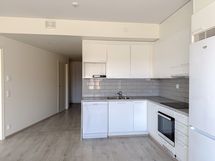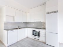 Keittiö on moderni ja käytännöllinen, harmailla työtasoilla ja harmaalla välitilan laatalla. Keittiö on varustettu induktioliedellä, astianpesukoneella ja jääkaappi-pakastimella, joten arjen ruoanlaitto sujuu mukavasti.