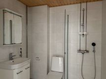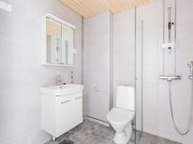 Kylpyhuone on tyylikäs ja moderni: harmaa lattialaatta yhdistyy valkoiseen seinälaattaan, ja tilaa löytyy myös pyykinpesukoneelle.
