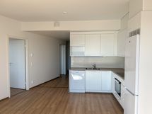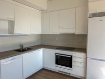 Keittiö on moderni ja käytännöllinen, harmailla työtasoilla ja harmaalla välitilan laatalla. Keittiö on varustettu induktioliedellä, astianpesukoneella ja jääkaappi-pakastimella, joten arjen ruoanlaitto sujuu mukavasti.