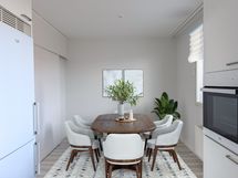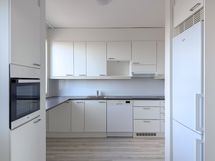 Tämä kokoinen kolmio tarjoaa runsaasti tilaa ja erinomaisen pohjaratkaisun, joka tekee arjesta sujuvaa. Kodin erillinen keittiö on suunniteltu käytännölliseksi ja sinne mahtuu hyvin ruokapöytä. Keittiössä on sopivasti kaappitilaa ja työskentelytasoa, induktioliesi, valkoinen välitilan laatta, harmaa työtaso sekä integroitu astianpesukone.