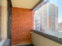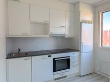 Keittiö sijoittuu omaan nurkkaansa ja siellä on hyvin työskentelytilaa sekä ikkuna tuomassa luonnonvaloa ruoanlaittoon. Varusteluun kuuluvat induktioliesi, valkoinen välitilan laatta, harmaa työtaso sekä integroitu astianpesukone. Makuuhuone on hyvän kokoinen ja helposti kalustettavissa, ja lasitettu parveke tuo lisää tilaa lähes ympäri vuoden. Uusi taloyhtiö takaa modernin ja helpon asumisen.