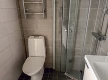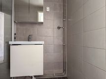 Heti edessä sijaitsee kompakti, täysin laatoitettu kylpyhuone, jossa on paikka pyykinpesukoneelle ja taittuvat lasiset suihkuseinät, jotka lisäävät tilantuntua. Asunnon vaalea lattia ja suuret ikkunat tekevät kokonaisuudesta valoisankin pilvisenä päivänä.