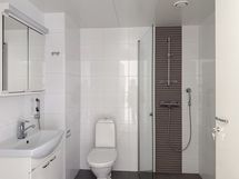 Kylpyhuoneessa on harmaa lattialaatta ja seinillä yhdistelmä valkoista ja harmaata laattaa. Tilaa löytyy myös pyykinpesukoneelle, ja modernit vesikalusteet viimeistelevät tilan tyylikkään ilmeen. Lasitettu parveke tuo lisävaloa ja mukavan oleskelutilan.