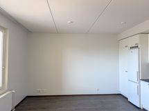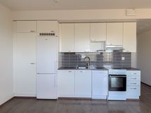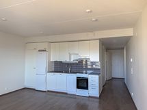 Asunnon lattiat ovat kauniin tumman puun sävyistä laminaattia, mikä luo harmonisen ja lämpimän tunnelman. Keittiö on käytännöllinen ja tyylikäs: työtasot ja välitilan laatta ovat harmaat, ja keittiö on varustettu keraamisella uunilla, astianpesukoneella ja jääkaappi-pakastimella.