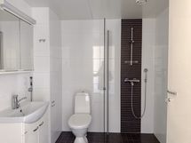 Kylpyhuoneessa on harmaa lattialaatta ja seinillä yhdistelmä valkoista ja harmaata laattaa. Tilaa löytyy myös pyykinpesukoneelle, ja modernit vesikalusteet viimeistelevät tilan tyylikkään ilmeen. Lasitettu parveke tuo lisävaloa ja mukavan oleskelutilan.