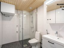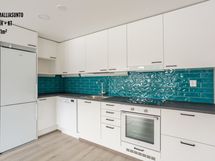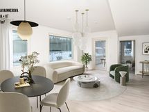 The five floor residential building has 47 apartments ranging from studios to three-bedroom apartments. The apartments have either a French balcony, balcony, yard, or a unique combination of a terrace and yard. The apartments have brown-toned laminate flooring and light surface materials. The kitchen is equipped with a dishwasher, built-in oven, induction stove, and a refrigerator-freezer combination. The bathroom has electric underfloor heating and a space for a washing machine and dryer. The bathroom has white wall tiles and black floor tiles. Shared facilities for residents include a sauna, storage for belongings and strollers, and an outdoor equipment storage.