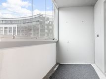 Tässä asunnossa on lasitettu parveke, sekä vaaleat tyylikkäät pintamateriaalit.