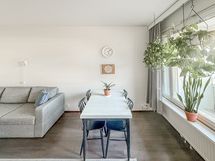 Tämä tilava ja avara kaksio on helppo sisustaa omaksi kodiksi selkeän pohjaratkaisun ansiosta. Keittiössä on hyvin työskentelytilaa ja olohuoneeseen on helppo rajata tilat ruokailuun ja oleskeluun. Makuuhuone on tilava ja kaappitilaa sieltä löytyy runsaasti. Säilytystilaa löytyy myös eteisen kaapistoista sekä asunnolle kuuluvista varastotiloista. Kylpyhuone on siisti ja sinne saa pesukoneen mahtumaan. Lasitetulta parvekkeelta aukeaa viihtyisät ja rauhalliset näkymät yhtiön sisäpihan suuntaan.