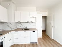 Keittiö on reilun kokoinen ja sinne mahtuu vaivatta suurempikin ruokapöytä. Runsaat työ- ja laskutilat tekevät ruoanlaitosta sujuvaa, ja astianpesukone helpottaa arjen askareita. Makuuhuoneessa on hyvin tilaa leveälle vuoteelle sekä runsaasti säilytystilaa kaapistoissa, minkä lisäksi erillinen vaatehuone tuo lisää käytännöllisyyttä.