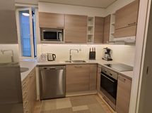 Paljon kaappitilaa, Paljon työskentelytilaa, Suuri tiskipöytä, Halogeenivalot, Teräskalusteet, Puutasot, Astianpesukone, Sähköliesi, Induktioliesi, Jääkaappi, Pakastin