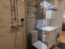 Suihku, Suihkuseinä, Pesukone, Allaskaappi, Rättipatteri, Laattalattia, Halogeenivalot, Laattaseinä, Lattialämmitys