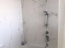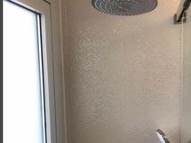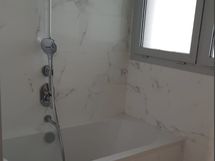 Suihku, Suihkuseinä, Kylpyamme, Pesukone, Kuivausrumpu, Allaskaappi, Peilikaappi, Laattalattia, Laattaseinä, Avattava ikkuna
