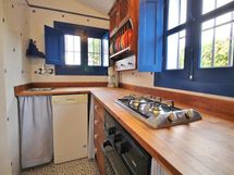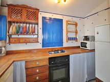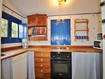 Keittiössä on hyvät varusteet. Siellä on esim. kaasuliesi, uuni, mikroaaltouuni, jää/pakastekaappi, kahvinkeitin ym. Keittiössä on myös ruokapöytä ja tuolit neljälle.