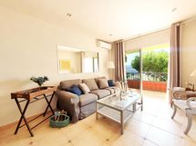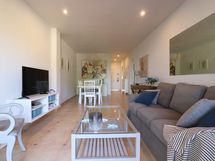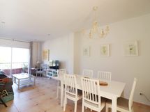 Olohuoneen pehmeässä sohvassa voit katsella televisiota. Toisessa päässä tätä pitkää huonetta on ruokailutila neljälle ruokailijalle. Huoneesta on käynti ulos parvekkeelle.