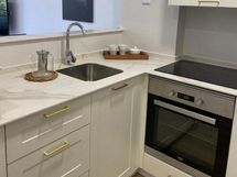 Keittiö on osittain avoin ja se luo huoneistoon avaraa tunnelmaa. Keittiö on varustettu hyvin. Siellä on esim. liesitaso, uuni, mikroaaltouuni, jää/pakastekaappi, kahvinkeitin, vedenkeitin, leivänpaahdin ym.
