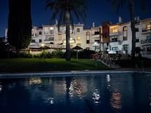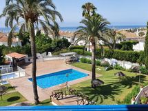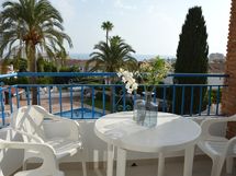 - Yhteisön aidatulle pihalle, jossa nurmikkoa, palmuja, kaksi uima-allasta ja lepotuoleja. Pohjoisen ikkunoista pysäköintipihalle ja ylös vuoriille