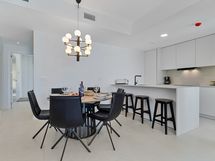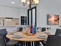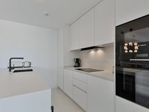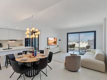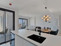 Avarassa, täysin varustellussa avokeittiössä on kaikki tarvittava ruoanlaittoon, ja se yhdistyy sujuvasti olohuoneeseen sekä suurelle terassille. Terassilla voit nauttia auringosta, illallisesta ulkona tai ihailla auringonlaskua meren yllä.