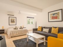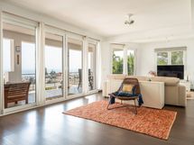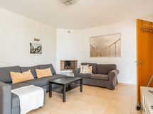 Olohuone on tilava ja valoisa, josta on upeat näkymät puutarhaan ja merelle suurten ikkunoiden kautta. Olohuoneessa on mukava sohva, taulu-tv ja moderni kalustus, joka luo rentouttavan ja kodikkaan ilmapiirin. Olohuoneesta on pääsy aurinkoiselle terassille. Alakerran takkahuoneesta on suora pääsy puutarhaan ja uima-altaalle.