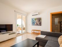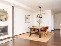 The living room is spacious and bright, with stunning views of the garden and the sea through large windows. The room has a comfortable sofa, a flat screen TV, and modern furnishings that create a relaxing and cosy atmosphere. The living room has access to a sunny terrace. The downstairs fireplace room has direct access to the garden and swimming pool.